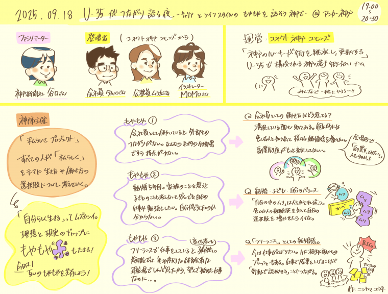 2025年9月18日(木曜)、神戸市中央区のビジネス交流拠点「アンカー神戸」で、「私らしさプロジェクト」の一環として、イベント「U-35がつながり語る夜―キャリアとライフスタイルのもやもや、話そう神戸で―」を開催しました。