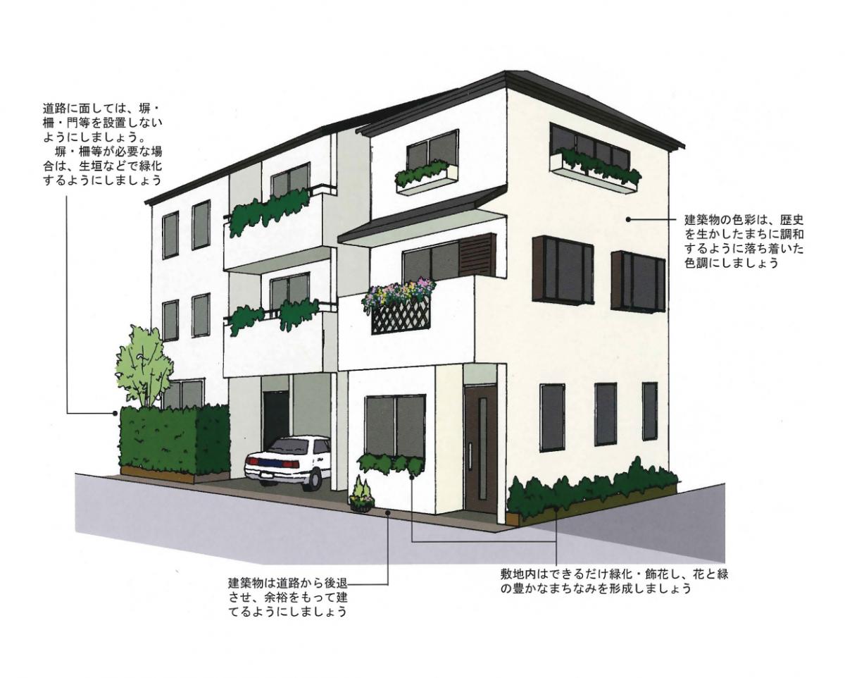 - 敷地内はできるだけ緑化・飾花し、沿道景観に努めましょう。また、塀・柵等が必要な場合は、生垣などで緑化するようにしましょう。