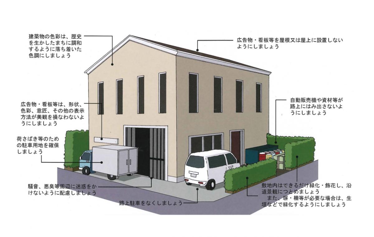 酒蔵のまちにふさわしいいえなみ景観を形成するため、建築物の色彩は落ちついた色調とする等、歴史を生かしたまちに調和する建築物となるよう配慮しましょう。