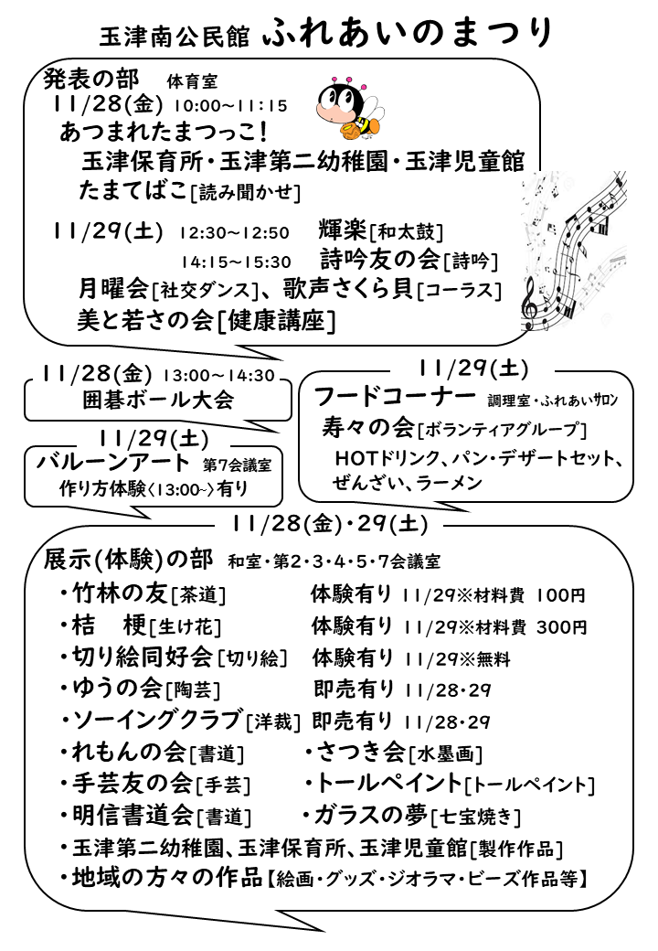公民館登録グループの作品展示や発表会、地域の方の作品展示、体験コーナー、即売会、公演会等を行います。
