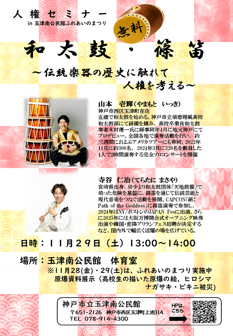 2024年度は、和太鼓奏者 山本 壱輝 氏、津軽三味線奏者 多田 智大 氏を招き「和太鼓・津軽三味線 ~日本の伝統楽器の歴史に触れる~」と題して、ご公演いただきました。2025年は、昨年に引き続き「伝統楽器の歴史に触れて人権を考える」と題して、和太鼓奏者 山本壱輝 氏と篠笛奏者 寺谷仁冶 氏を招き生の演奏をお聞きいただきます。11月29日(土曜)13時~14時に体育室で実施予定です。⇒今年のチラシ(PNG:467KB)
