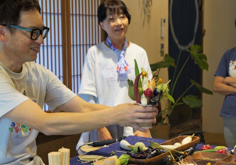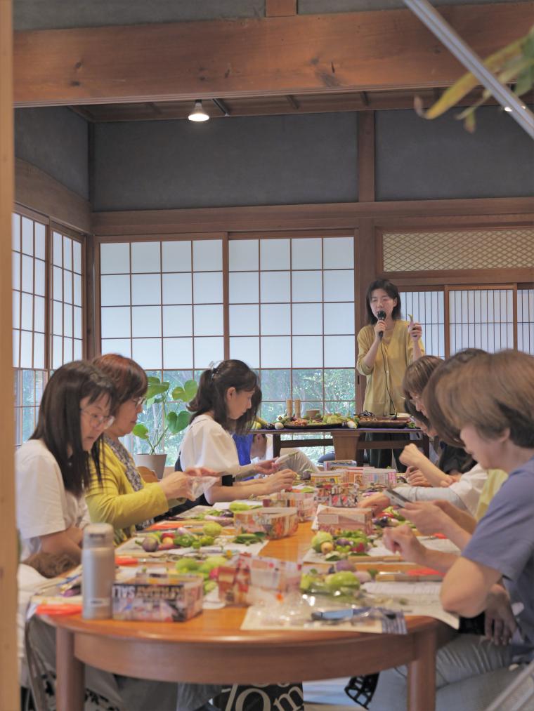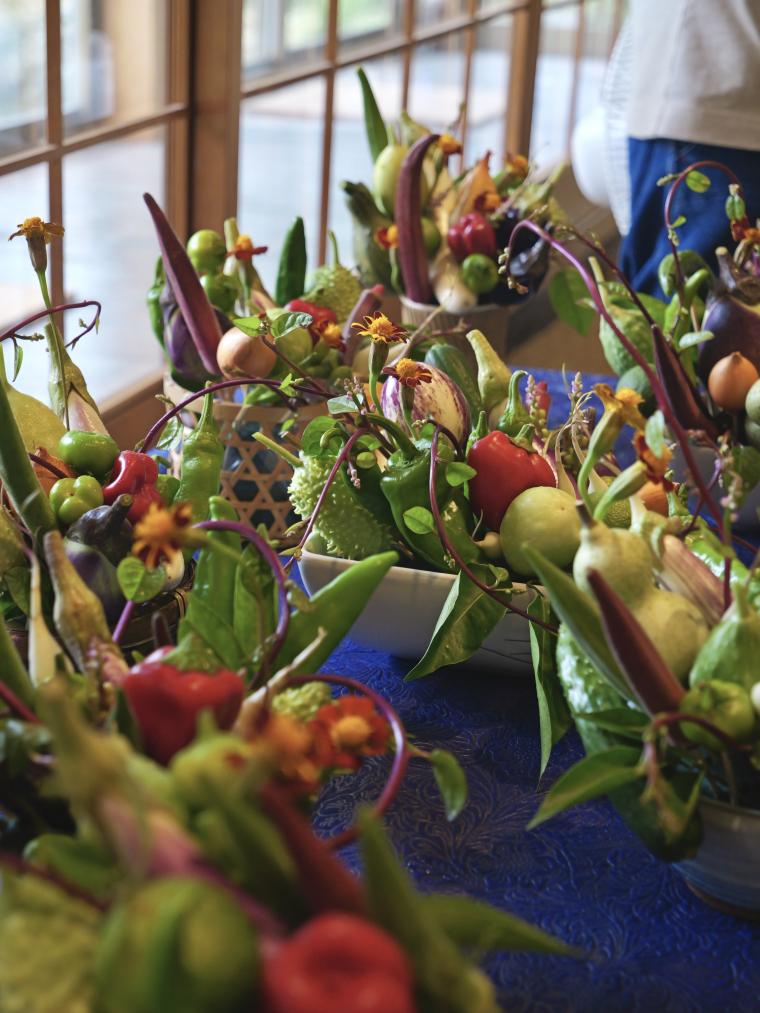 インタビューの後日、鈴木広史・彩さん夫妻が主催するワークショップ「ミニ野菜でブーケづくり」に職員も参加してみました。鈴木さんたちが栽培した美しい色合いの野菜を使って、自分ならではの野菜ブーケづくりに挑戦します。鈴木さんのデモンストレーションでは、迷いのない洗練された手付きで次々と野菜が美しいブーケに変身。実際にやってみると難しい!…ですが、1時間ほど夢中になって制作しました。視覚的にも食べても美味しい野菜の新たな魅力を感じることができました。